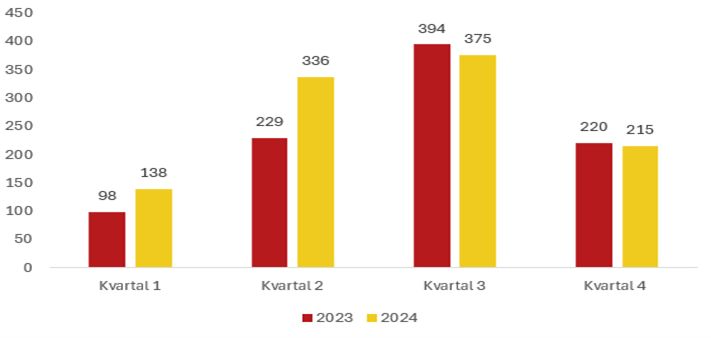 Diagrammet visar antalet stölder fördelat per kvartal under 2023 och 2024.